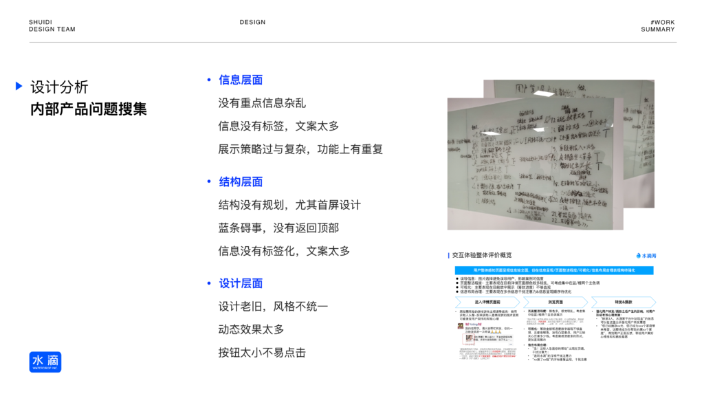 • 视觉噪音干扰:页面颜色较多较杂,品牌心智模糊。原有的“透明水滴”浮标等元素重复出现,干扰了用户的注意力流 。