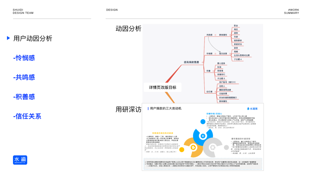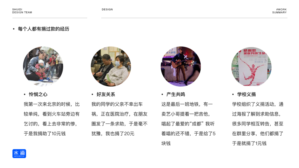 通过用研深访提炼出驱动捐款的底层动因,并将其转化为具体的设计触点。