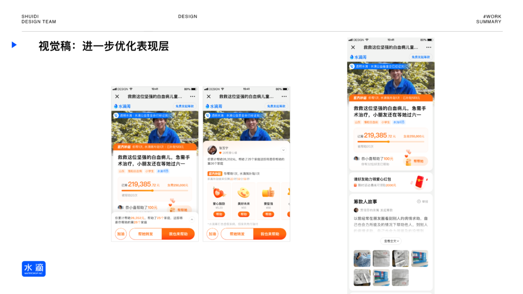 - 设计触点:构建“平台增信+关系增信”的双重体系,如医护证实、好友实名认证、筹款人保证书及透明水滴监控。
