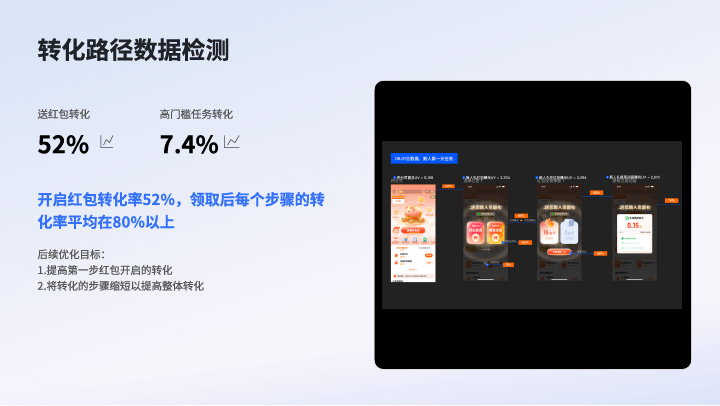 优化:1)根据数据优化点击路径,2)动效的吸引力不够(跳出率偏高)