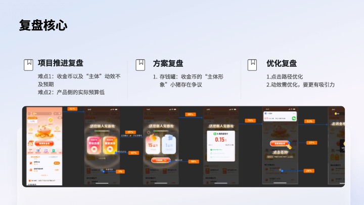 方案复盘:1)第一期方案略复杂,牵扯到的功能很多;2)其次是主体形象“存钱罐”形象存在争议