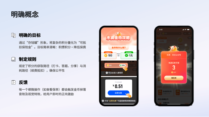 明确的目标 : 通过“存钱罐”形象,将复杂的积分量化为“可抵扣保险金”。目标简单清晰:积攒积分 = 降低保费。