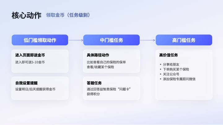 场景化任务: 引导用户点击“我的保单”页面(防范由于忘记保单导致的流失)、设置“每日提醒”(建立心智触达通道)。